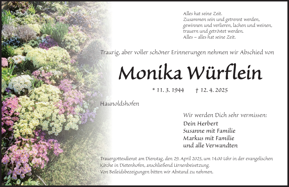 Hier finden Sie alle Traueranzeigen aus der Zeitung, die bisher für Monika Würflein erschienen sind. Weitere Traueranzeigen, die in der Zeitung erscheinen, werden hier ebenfalls aufgelistet