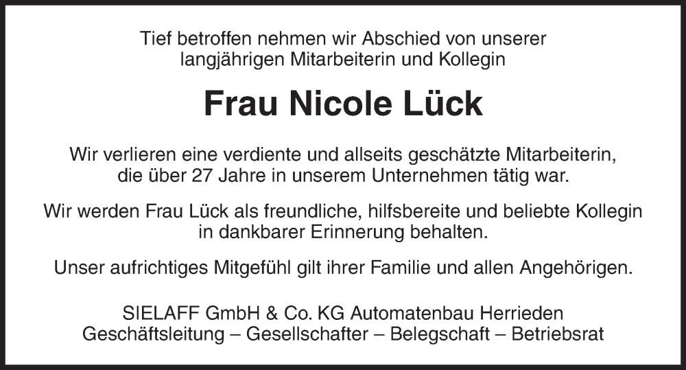 Hier finden Sie alle Traueranzeigen aus der Zeitung, die bisher für Nicole Lück erschienen sind. Weitere Traueranzeigen, die in der Zeitung erscheinen, werden hier ebenfalls aufgelistet