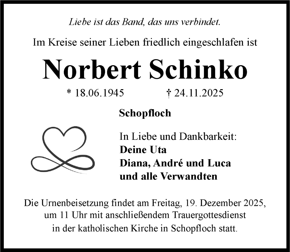 Hier finden Sie alle Traueranzeigen aus der Zeitung, die bisher für Norbert Schinko erschienen sind. Weitere Traueranzeigen, die in der Zeitung erscheinen, werden hier ebenfalls aufgelistet