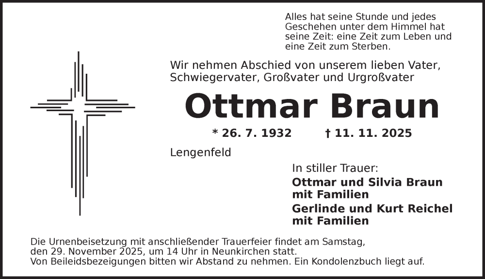 Hier finden Sie alle Traueranzeigen aus der Zeitung, die bisher für Ottmar Braun erschienen sind. Weitere Traueranzeigen, die in der Zeitung erscheinen, werden hier ebenfalls aufgelistet