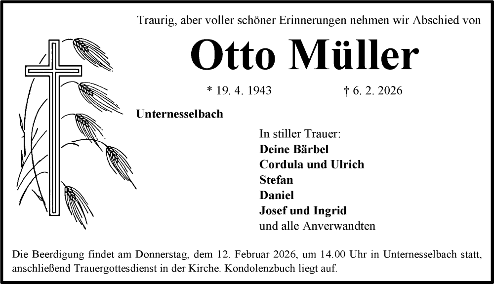 Hier finden Sie alle Traueranzeigen aus der Zeitung, die bisher für Otto Müller erschienen sind. Weitere Traueranzeigen, die in der Zeitung erscheinen, werden hier ebenfalls aufgelistet