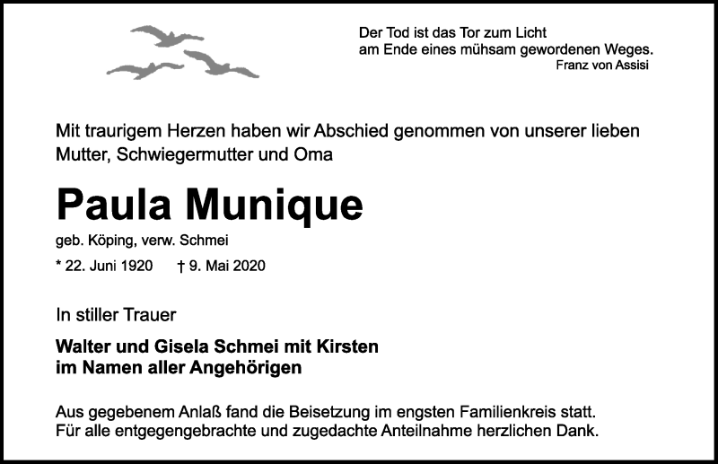 Hier finden Sie alle Traueranzeigen aus der Zeitung, die bisher für Paula Munique erschienen sind. Weitere Traueranzeigen, die in der Zeitung erscheinen, werden hier ebenfalls aufgelistet