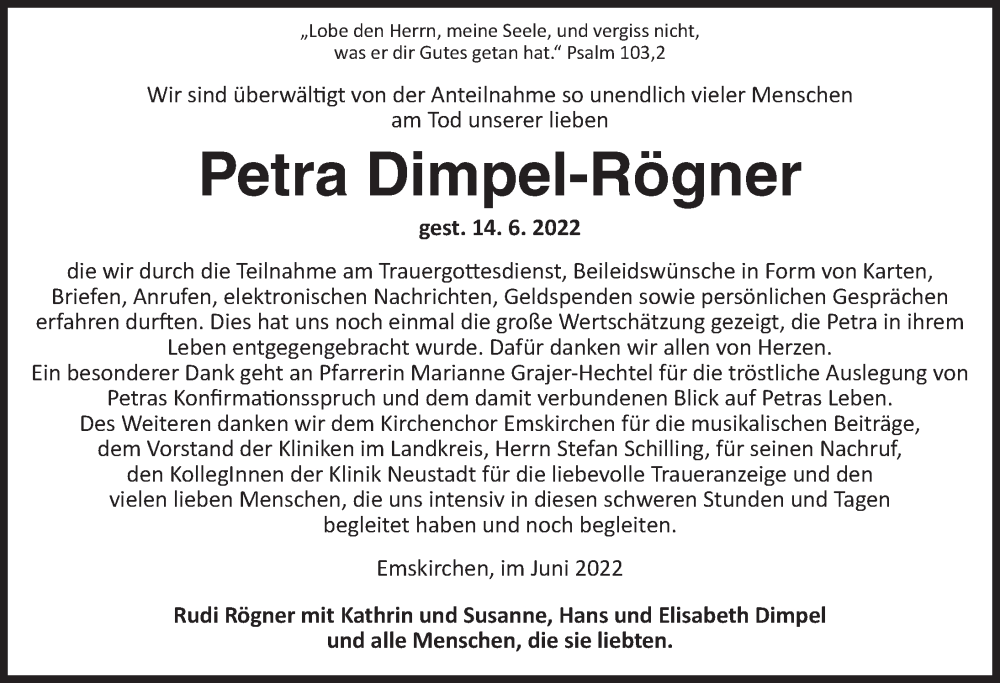 Hier finden Sie alle Traueranzeigen aus der Zeitung, die bisher für Petra Dimpel-Rögner erschienen sind. Weitere Traueranzeigen, die in der Zeitung erscheinen, werden hier ebenfalls aufgelistet