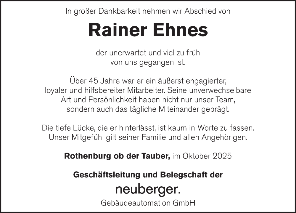 Hier finden Sie alle Traueranzeigen aus der Zeitung, die bisher für Rainer Ehnes erschienen sind. Weitere Traueranzeigen, die in der Zeitung erscheinen, werden hier ebenfalls aufgelistet