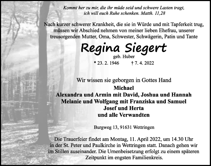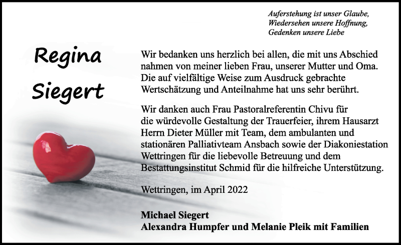 Hier finden Sie alle Traueranzeigen aus der Zeitung, die bisher für Regina Siegert erschienen sind. Weitere Traueranzeigen, die in der Zeitung erscheinen, werden hier ebenfalls aufgelistet