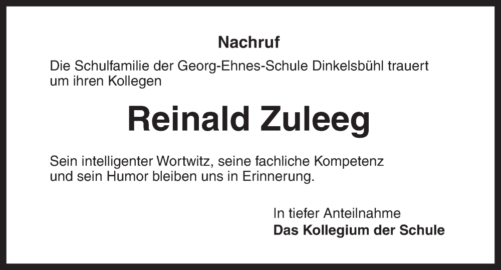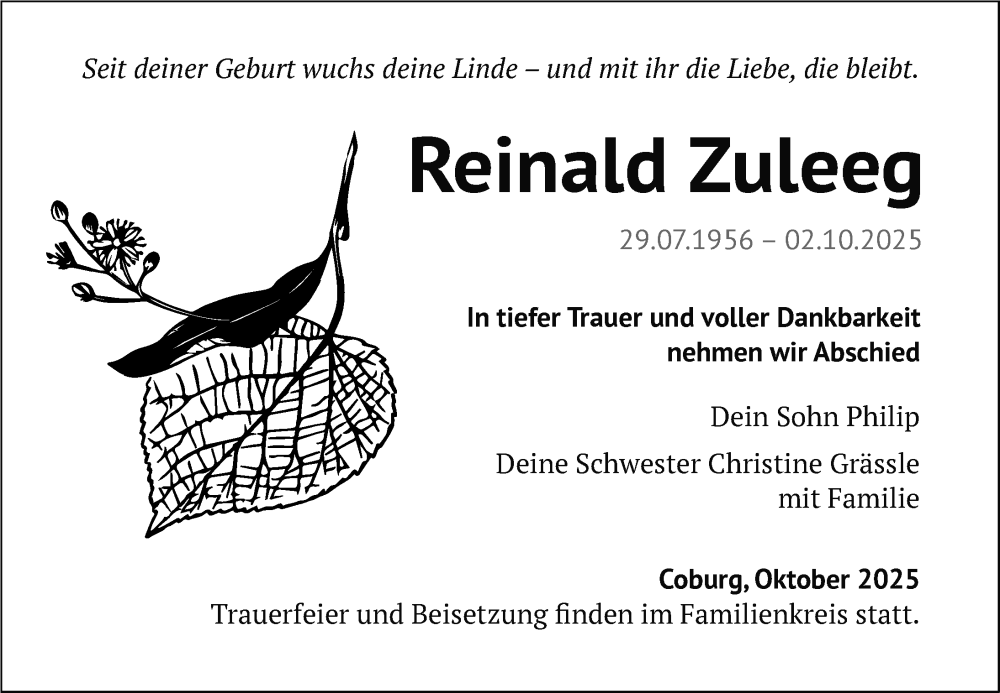 Hier finden Sie alle Traueranzeigen aus der Zeitung, die bisher für Reinald Zuleeg erschienen sind. Weitere Traueranzeigen, die in der Zeitung erscheinen, werden hier ebenfalls aufgelistet