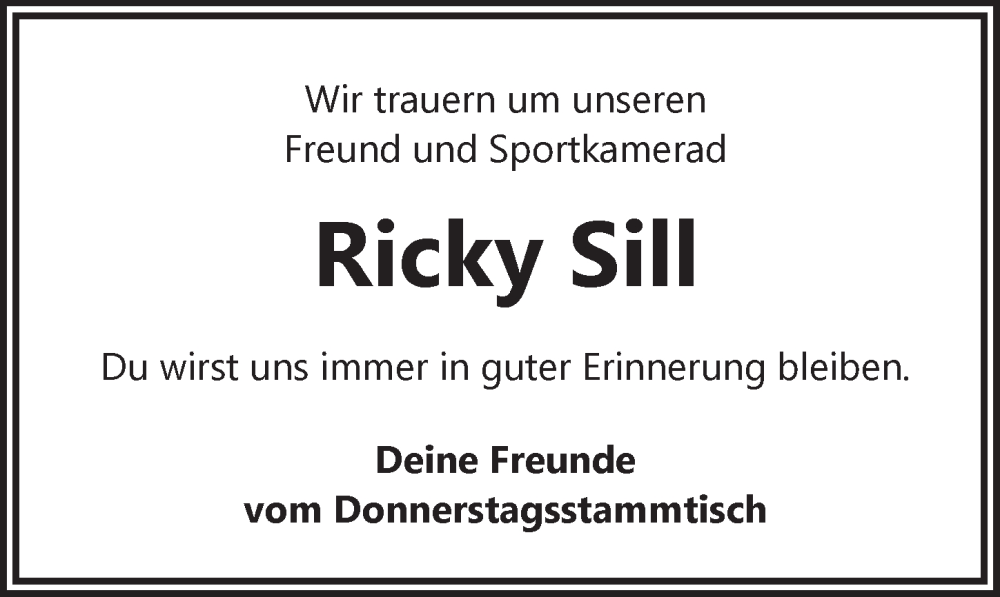 Hier finden Sie alle Traueranzeigen aus der Zeitung, die bisher für Ricky Sill erschienen sind. Weitere Traueranzeigen, die in der Zeitung erscheinen, werden hier ebenfalls aufgelistet