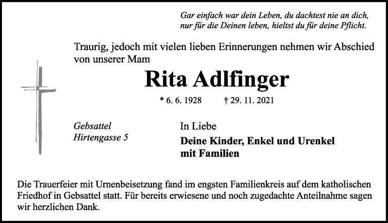 Hier finden Sie alle Traueranzeigen aus der Zeitung, die bisher für Rita Adlfinger erschienen sind. Weitere Traueranzeigen, die in der Zeitung erscheinen, werden hier ebenfalls aufgelistet