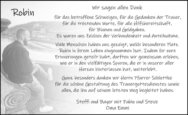 Hier finden Sie alle Traueranzeigen aus der Zeitung, die bisher für Robin erschienen sind. Weitere Traueranzeigen, die in der Zeitung erscheinen, werden hier ebenfalls aufgelistet