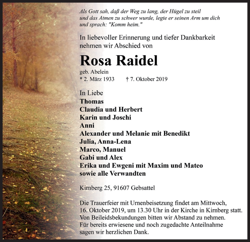 Hier finden Sie alle Traueranzeigen aus der Zeitung, die bisher für Rosa Raidel erschienen sind. Weitere Traueranzeigen, die in der Zeitung erscheinen, werden hier ebenfalls aufgelistet