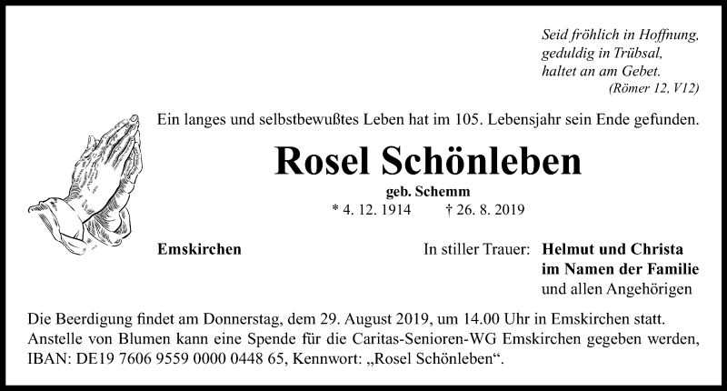Hier finden Sie alle Traueranzeigen aus der Zeitung, die bisher für Rosel Schönleben erschienen sind. Weitere Traueranzeigen, die in der Zeitung erscheinen, werden hier ebenfalls aufgelistet