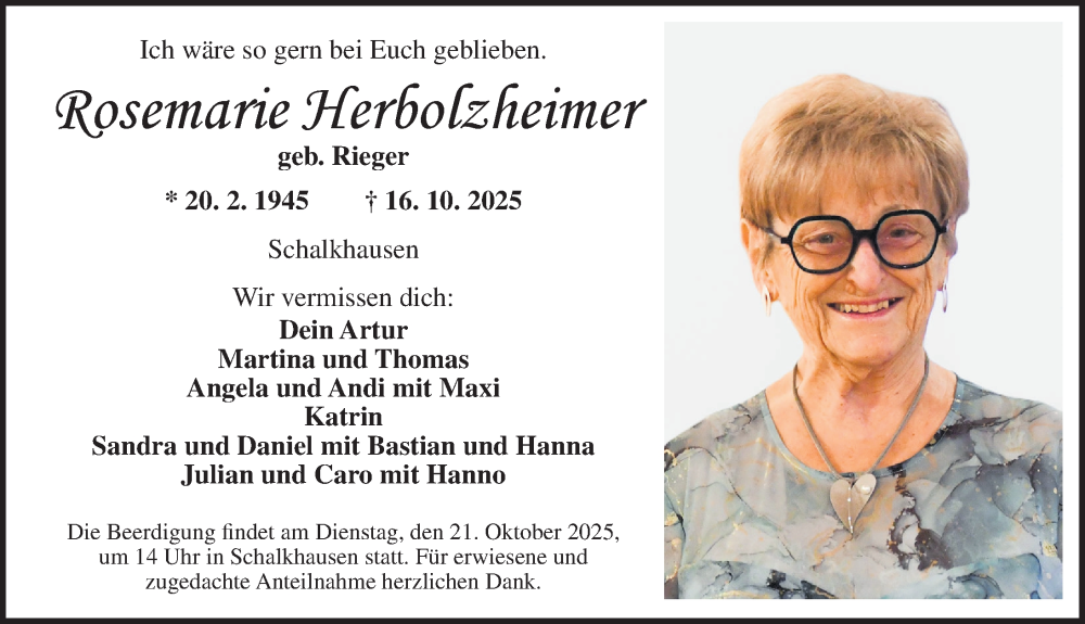 Hier finden Sie alle Traueranzeigen aus der Zeitung, die bisher für Rosemarie Herbolzheimer erschienen sind. Weitere Traueranzeigen, die in der Zeitung erscheinen, werden hier ebenfalls aufgelistet