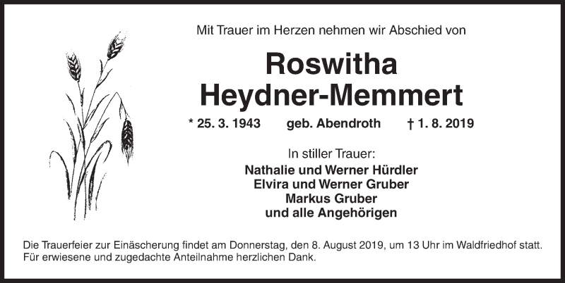Hier finden Sie alle Traueranzeigen aus der Zeitung, die bisher für Roswitha Heydner-Memmert erschienen sind. Weitere Traueranzeigen, die in der Zeitung erscheinen, werden hier ebenfalls aufgelistet