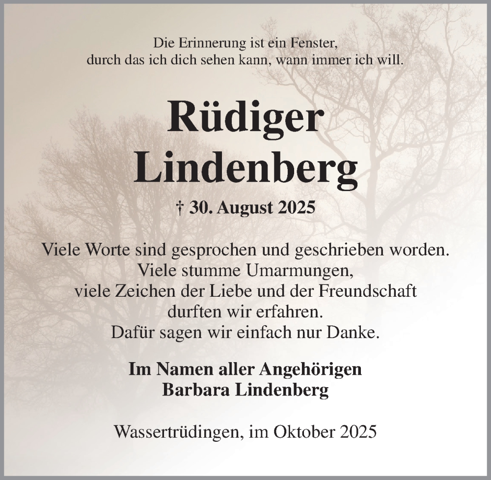 Hier finden Sie alle Traueranzeigen aus der Zeitung, die bisher für Rüdiger Lindenberg erschienen sind. Weitere Traueranzeigen, die in der Zeitung erscheinen, werden hier ebenfalls aufgelistet