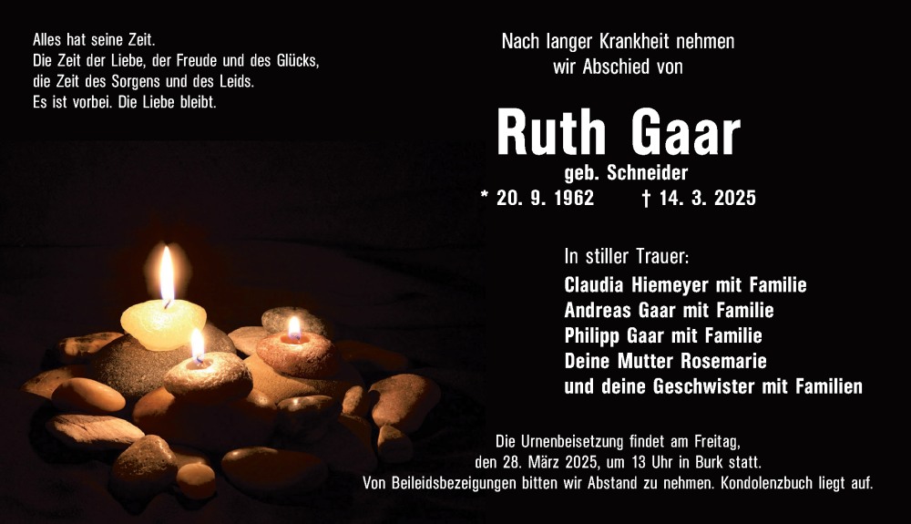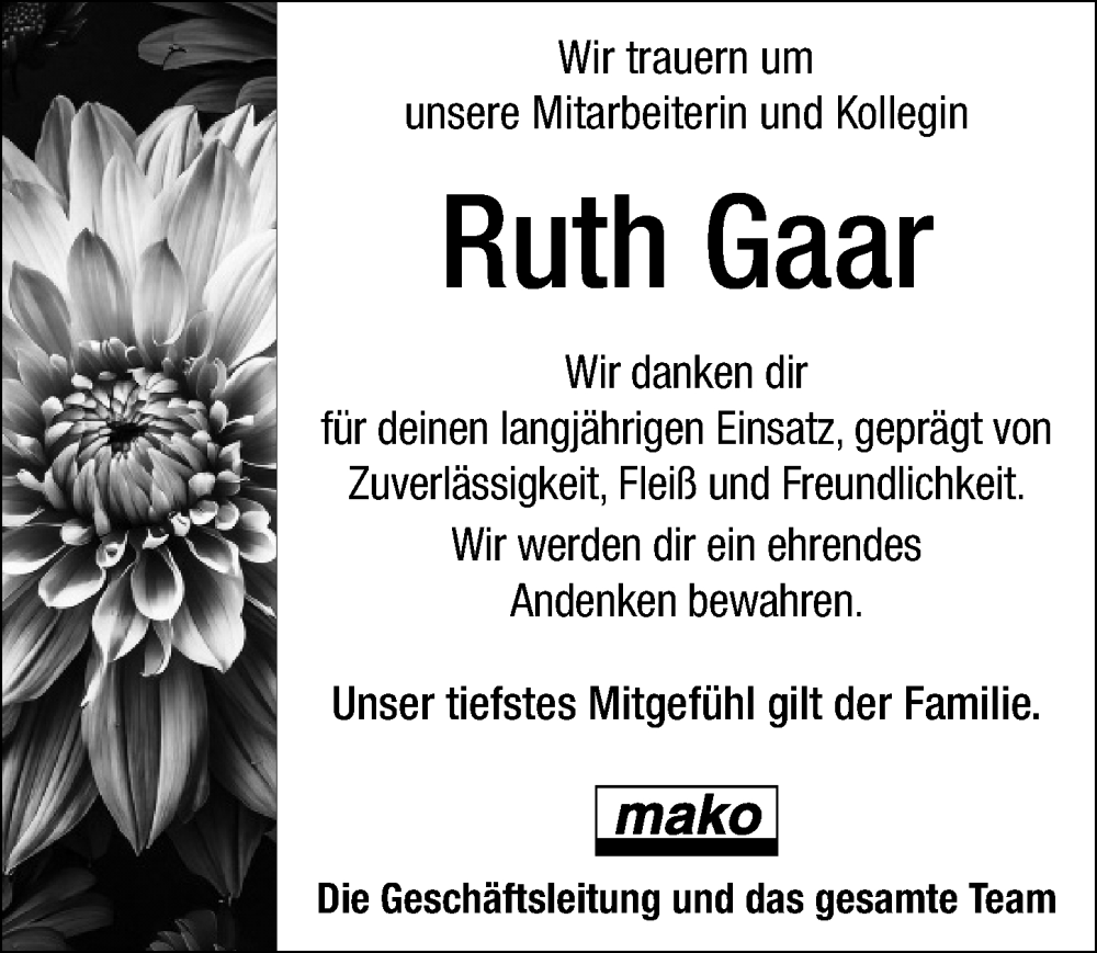 Hier finden Sie alle Traueranzeigen aus der Zeitung, die bisher für Ruth Gaar erschienen sind. Weitere Traueranzeigen, die in der Zeitung erscheinen, werden hier ebenfalls aufgelistet