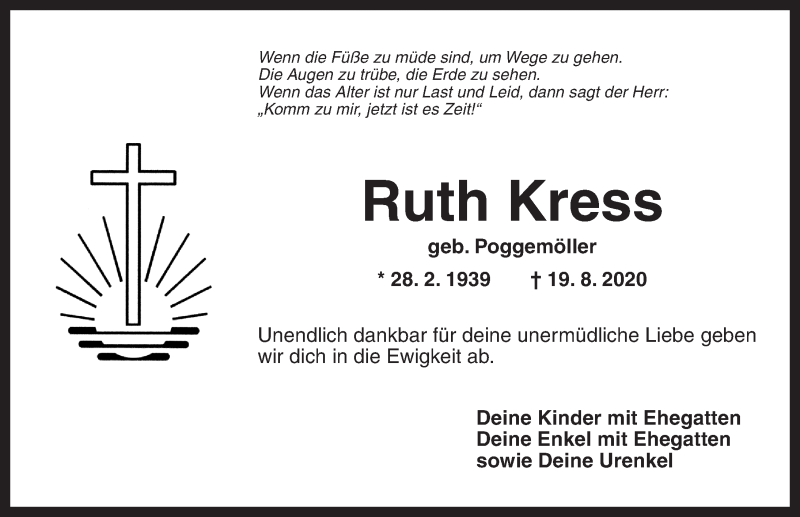 Hier finden Sie alle Traueranzeigen aus der Zeitung, die bisher für Ruth Kress erschienen sind. Weitere Traueranzeigen, die in der Zeitung erscheinen, werden hier ebenfalls aufgelistet