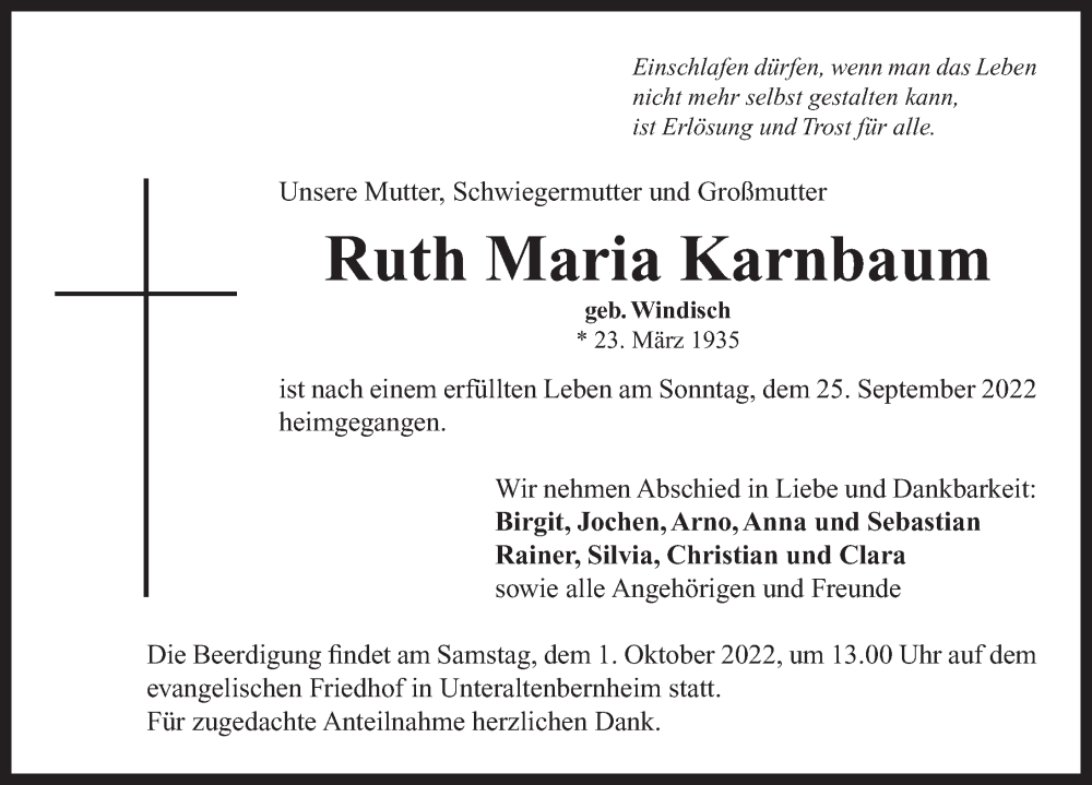 Hier finden Sie alle Traueranzeigen aus der Zeitung, die bisher für Ruth Maria Karnbaum erschienen sind. Weitere Traueranzeigen, die in der Zeitung erscheinen, werden hier ebenfalls aufgelistet