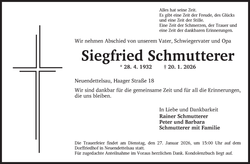 Hier finden Sie alle Traueranzeigen aus der Zeitung, die bisher für Siegfried Schmutterer erschienen sind. Weitere Traueranzeigen, die in der Zeitung erscheinen, werden hier ebenfalls aufgelistet