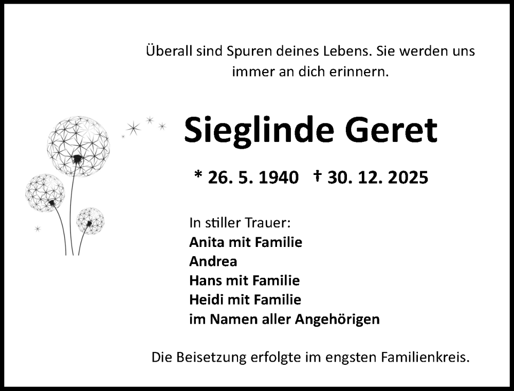 Hier finden Sie alle Traueranzeigen aus der Zeitung, die bisher für Sieglinde Geret erschienen sind. Weitere Traueranzeigen, die in der Zeitung erscheinen, werden hier ebenfalls aufgelistet