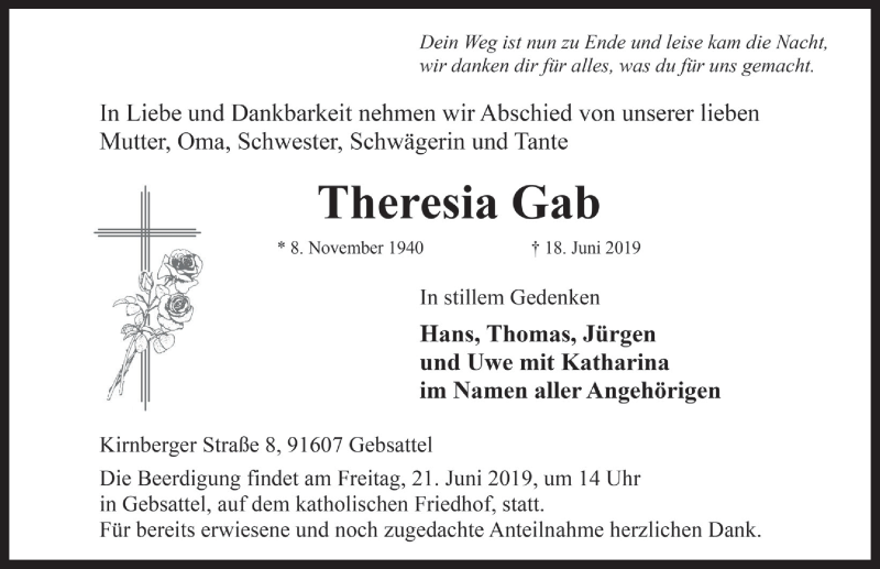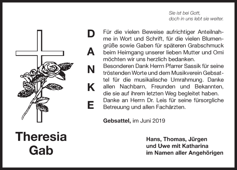 Hier finden Sie alle Traueranzeigen aus der Zeitung, die bisher für Theresia Gab erschienen sind. Weitere Traueranzeigen, die in der Zeitung erscheinen, werden hier ebenfalls aufgelistet
