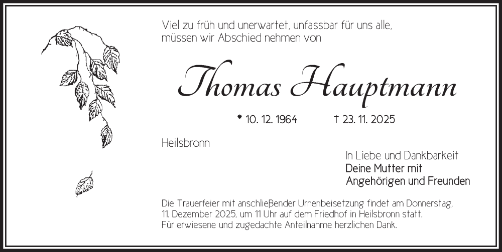 Hier finden Sie alle Traueranzeigen aus der Zeitung, die bisher für Thomas Hauptmann erschienen sind. Weitere Traueranzeigen, die in der Zeitung erscheinen, werden hier ebenfalls aufgelistet