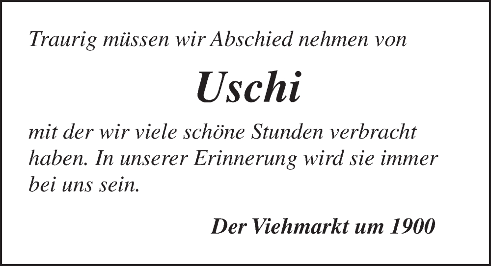 Hier finden Sie alle Traueranzeigen aus der Zeitung, die bisher für Uschi erschienen sind. Weitere Traueranzeigen, die in der Zeitung erscheinen, werden hier ebenfalls aufgelistet