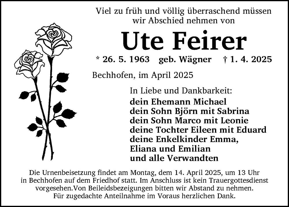 Hier finden Sie alle Traueranzeigen aus der Zeitung, die bisher für Ute Feirer erschienen sind. Weitere Traueranzeigen, die in der Zeitung erscheinen, werden hier ebenfalls aufgelistet