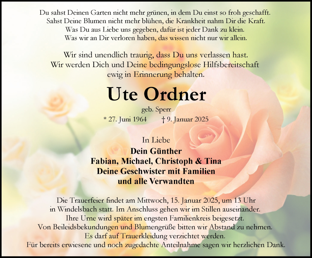 Hier finden Sie alle Traueranzeigen aus der Zeitung, die bisher für Ute Ordner erschienen sind. Weitere Traueranzeigen, die in der Zeitung erscheinen, werden hier ebenfalls aufgelistet