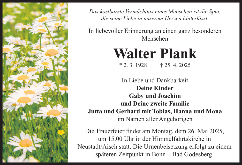 Hier finden Sie alle Traueranzeigen aus der Zeitung, die bisher für Walter Plank erschienen sind. Weitere Traueranzeigen, die in der Zeitung erscheinen, werden hier ebenfalls aufgelistet