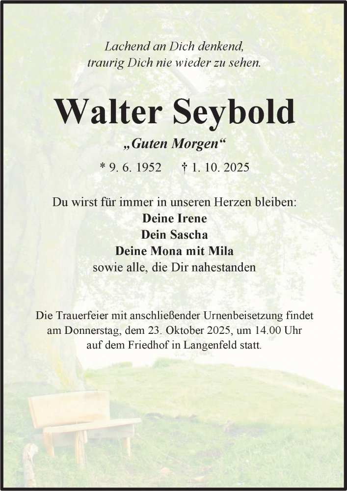 Hier finden Sie alle Traueranzeigen aus der Zeitung, die bisher für Walter Seybold erschienen sind. Weitere Traueranzeigen, die in der Zeitung erscheinen, werden hier ebenfalls aufgelistet