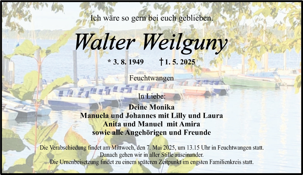 Hier finden Sie alle Traueranzeigen aus der Zeitung, die bisher für Walter Weilguny erschienen sind. Weitere Traueranzeigen, die in der Zeitung erscheinen, werden hier ebenfalls aufgelistet