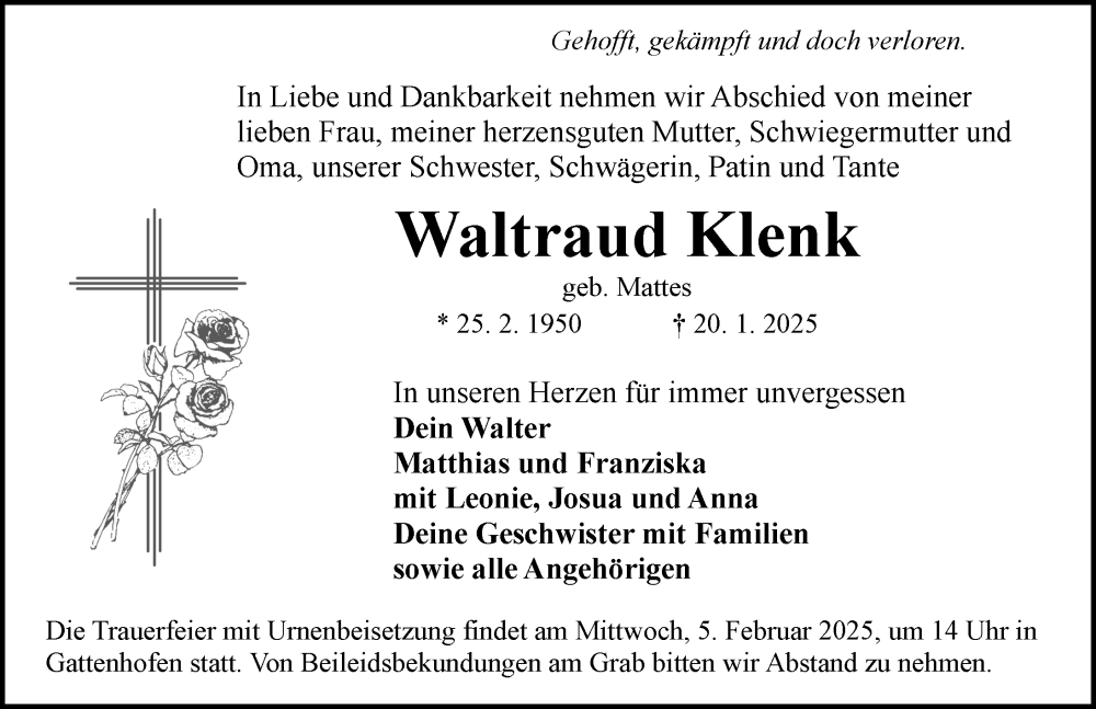 Hier finden Sie alle Traueranzeigen aus der Zeitung, die bisher für Waltraud Klenk erschienen sind. Weitere Traueranzeigen, die in der Zeitung erscheinen, werden hier ebenfalls aufgelistet