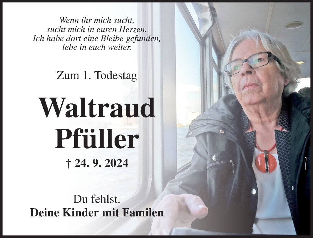 Hier finden Sie alle Traueranzeigen aus der Zeitung, die bisher für Waltraud Pfüller erschienen sind. Weitere Traueranzeigen, die in der Zeitung erscheinen, werden hier ebenfalls aufgelistet