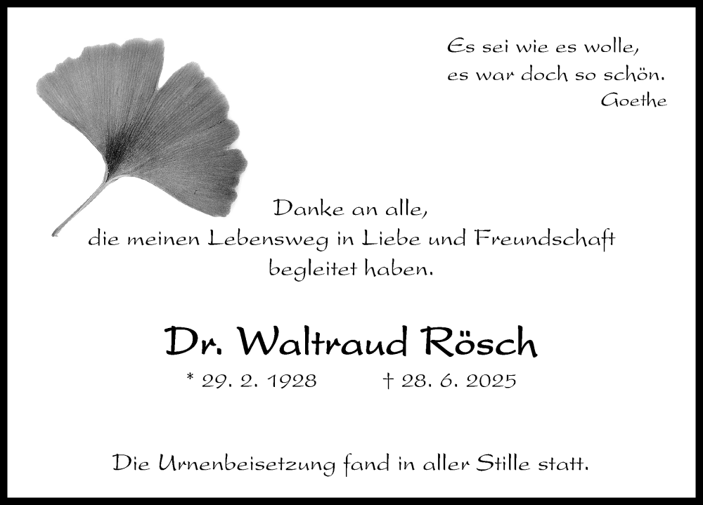 Hier finden Sie alle Traueranzeigen aus der Zeitung, die bisher für Waltraud Rösch erschienen sind. Weitere Traueranzeigen, die in der Zeitung erscheinen, werden hier ebenfalls aufgelistet