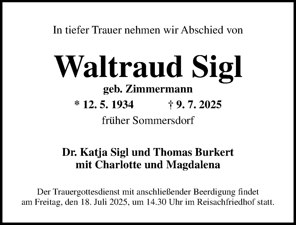 Hier finden Sie alle Traueranzeigen aus der Zeitung, die bisher für Waltraud Sigl erschienen sind. Weitere Traueranzeigen, die in der Zeitung erscheinen, werden hier ebenfalls aufgelistet