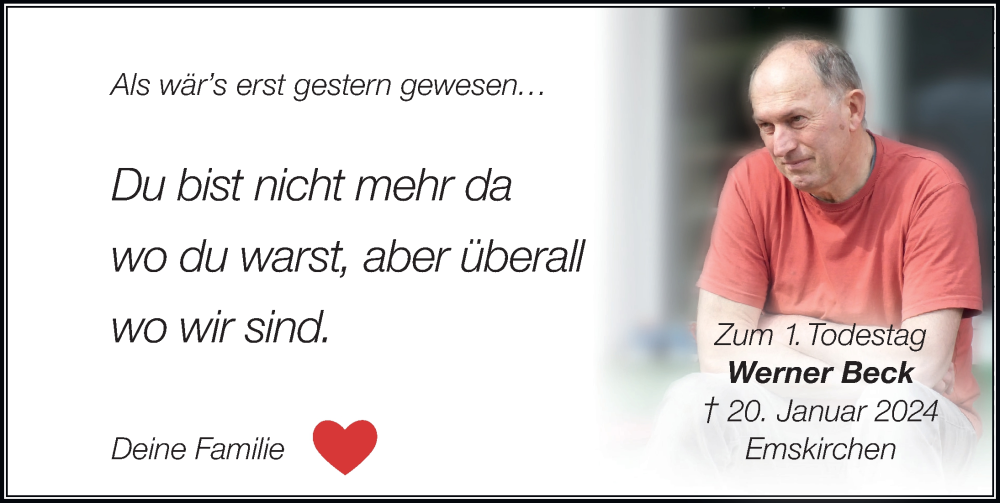 Hier finden Sie alle Traueranzeigen aus der Zeitung, die bisher für Werner Beck erschienen sind. Weitere Traueranzeigen, die in der Zeitung erscheinen, werden hier ebenfalls aufgelistet