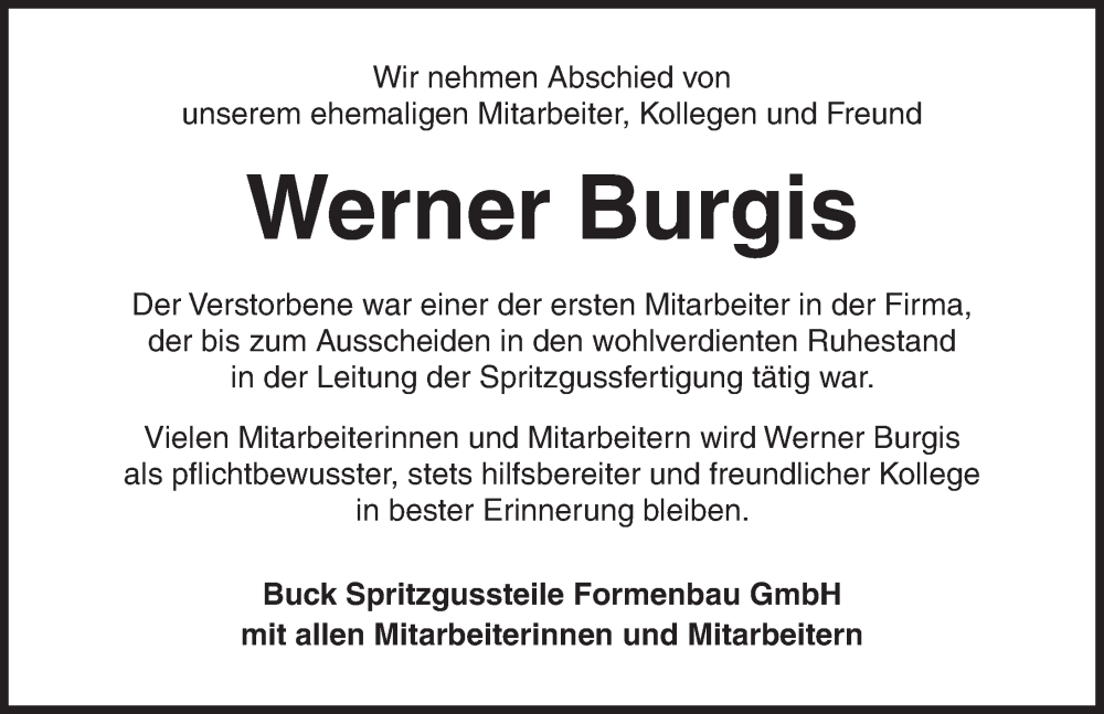 Hier finden Sie alle Traueranzeigen aus der Zeitung, die bisher für Werner Burgis erschienen sind. Weitere Traueranzeigen, die in der Zeitung erscheinen, werden hier ebenfalls aufgelistet