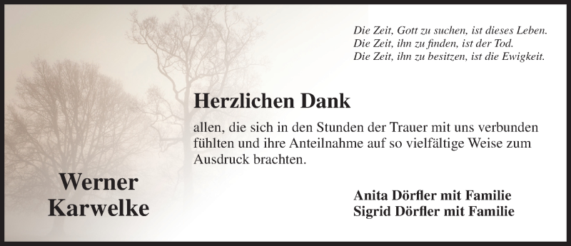 Hier finden Sie alle Traueranzeigen aus der Zeitung, die bisher für Werner Karwelke erschienen sind. Weitere Traueranzeigen, die in der Zeitung erscheinen, werden hier ebenfalls aufgelistet