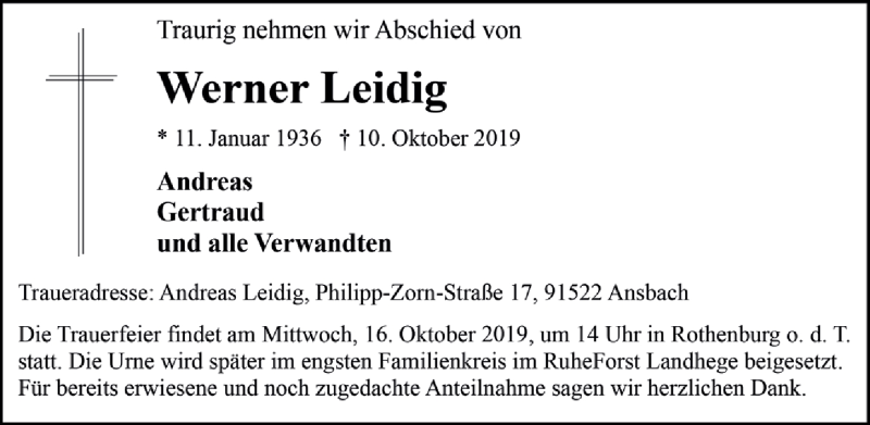 Hier finden Sie alle Traueranzeigen aus der Zeitung, die bisher für Werner Leidig erschienen sind. Weitere Traueranzeigen, die in der Zeitung erscheinen, werden hier ebenfalls aufgelistet