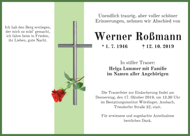 Hier finden Sie alle Traueranzeigen aus der Zeitung, die bisher für Werner Roßmann erschienen sind. Weitere Traueranzeigen, die in der Zeitung erscheinen, werden hier ebenfalls aufgelistet