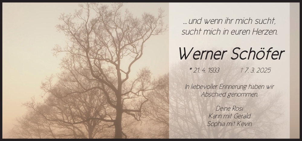 Hier finden Sie alle Traueranzeigen aus der Zeitung, die bisher für Werner Schöfer erschienen sind. Weitere Traueranzeigen, die in der Zeitung erscheinen, werden hier ebenfalls aufgelistet