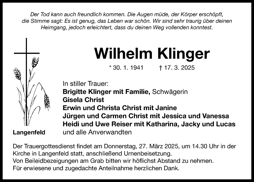 Hier finden Sie alle Traueranzeigen aus der Zeitung, die bisher für Wilhelm Klinger erschienen sind. Weitere Traueranzeigen, die in der Zeitung erscheinen, werden hier ebenfalls aufgelistet