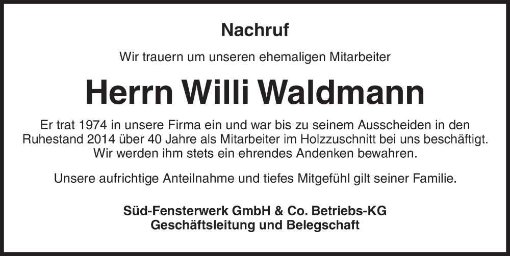 Hier finden Sie alle Traueranzeigen aus der Zeitung, die bisher für Willi Waldmann erschienen sind. Weitere Traueranzeigen, die in der Zeitung erscheinen, werden hier ebenfalls aufgelistet
