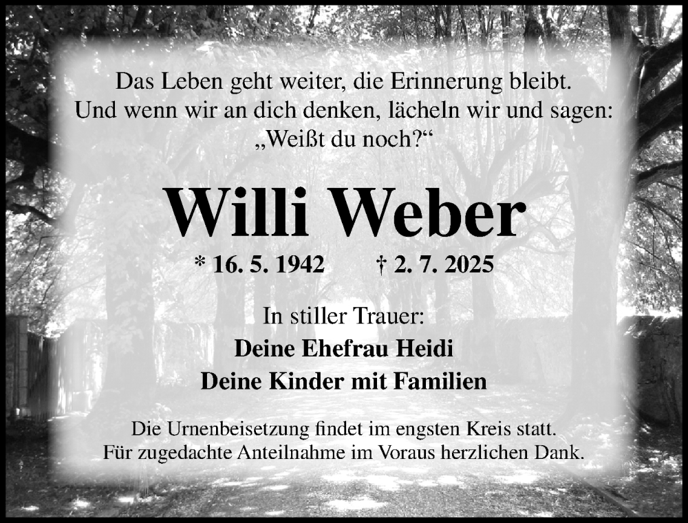 Hier finden Sie alle Traueranzeigen aus der Zeitung, die bisher für Willi Weber erschienen sind. Weitere Traueranzeigen, die in der Zeitung erscheinen, werden hier ebenfalls aufgelistet