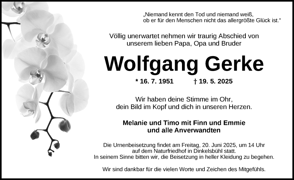 Hier finden Sie alle Traueranzeigen aus der Zeitung, die bisher für Wolfgang Gerke erschienen sind. Weitere Traueranzeigen, die in der Zeitung erscheinen, werden hier ebenfalls aufgelistet